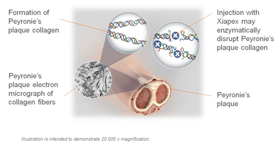 The signs and symptoms of Peyronie’s disease are caused by a collagen plaque. Injection of Xiapex into a Peyronie’s plaque, which is comprised mostly of collagen, may result in enzymatic disruption of the plaque. Following this disruption of the plaque, penile curvature deformity and patient bother caused by Peyronie’s disease are reduced.